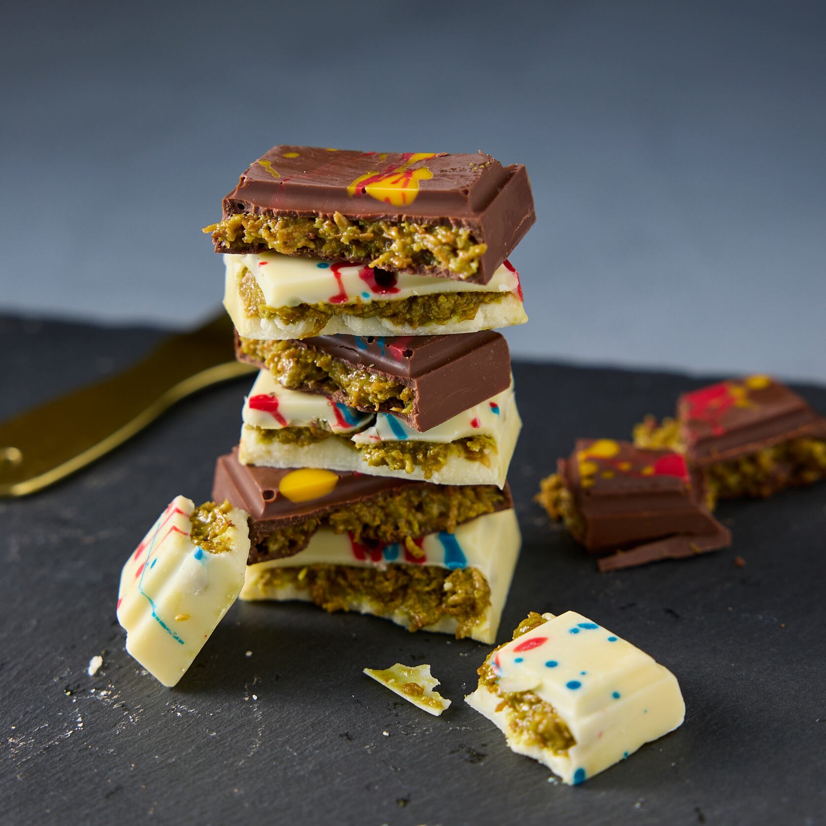 原材料名:カダイフ(フランス製造)、チョコレート、ピスタチオペースト、ごまペースト/着色料(青1、赤40、黄4)、香料、乳化剤